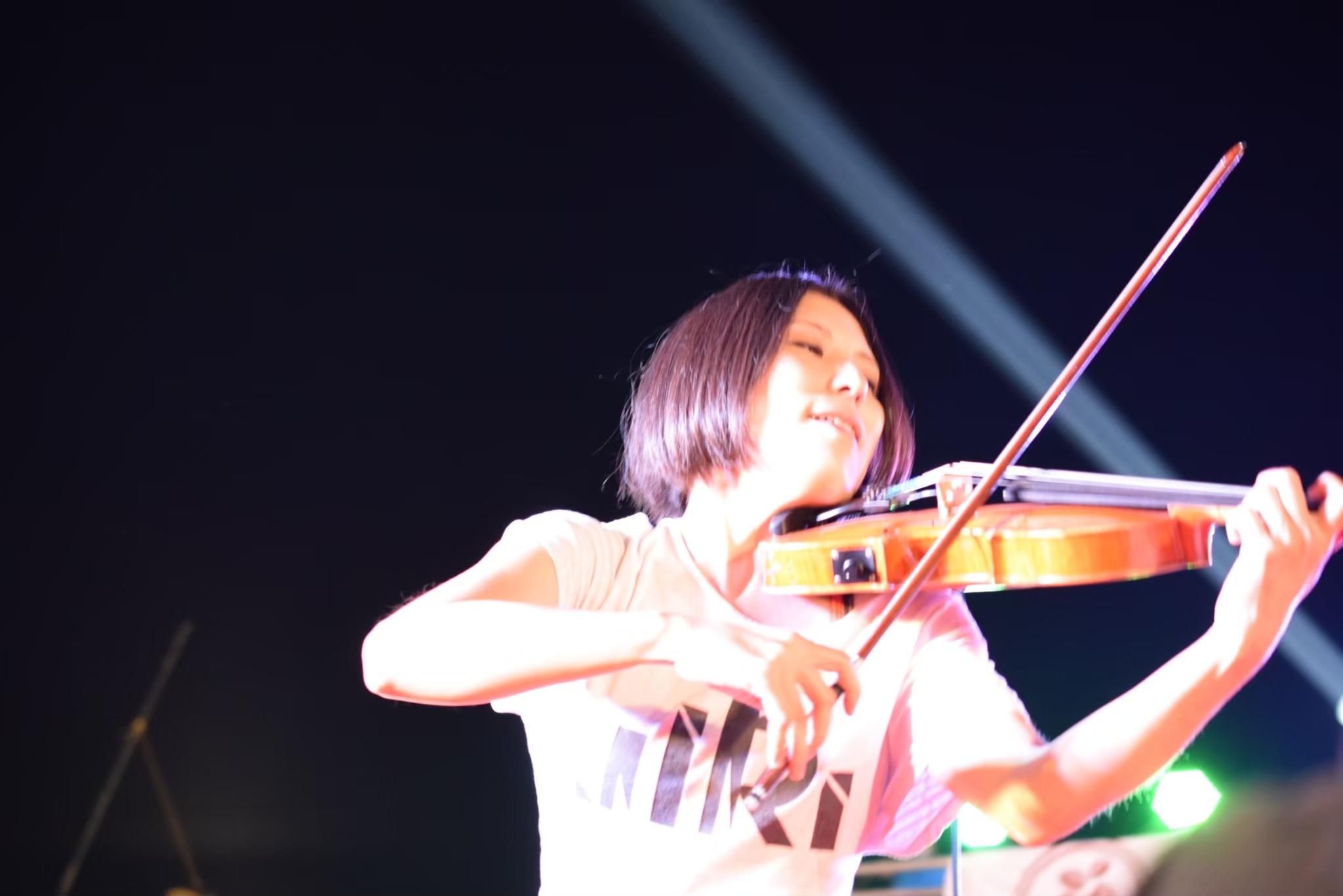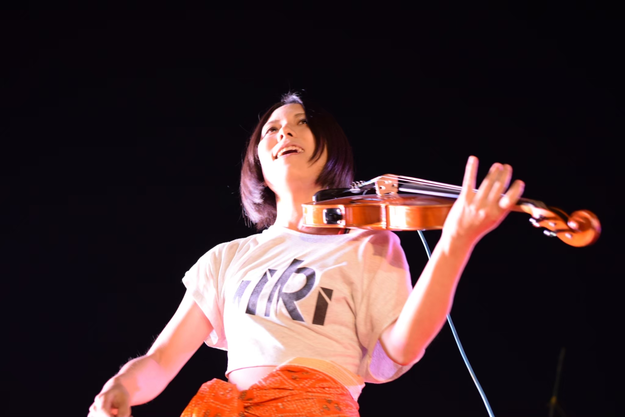 ソロでは即興表現と身体表現の融合を探求し、バイオリンをモジュラーシンセサイザーに繋いで音を重ねていく唯一無二のスタイル。